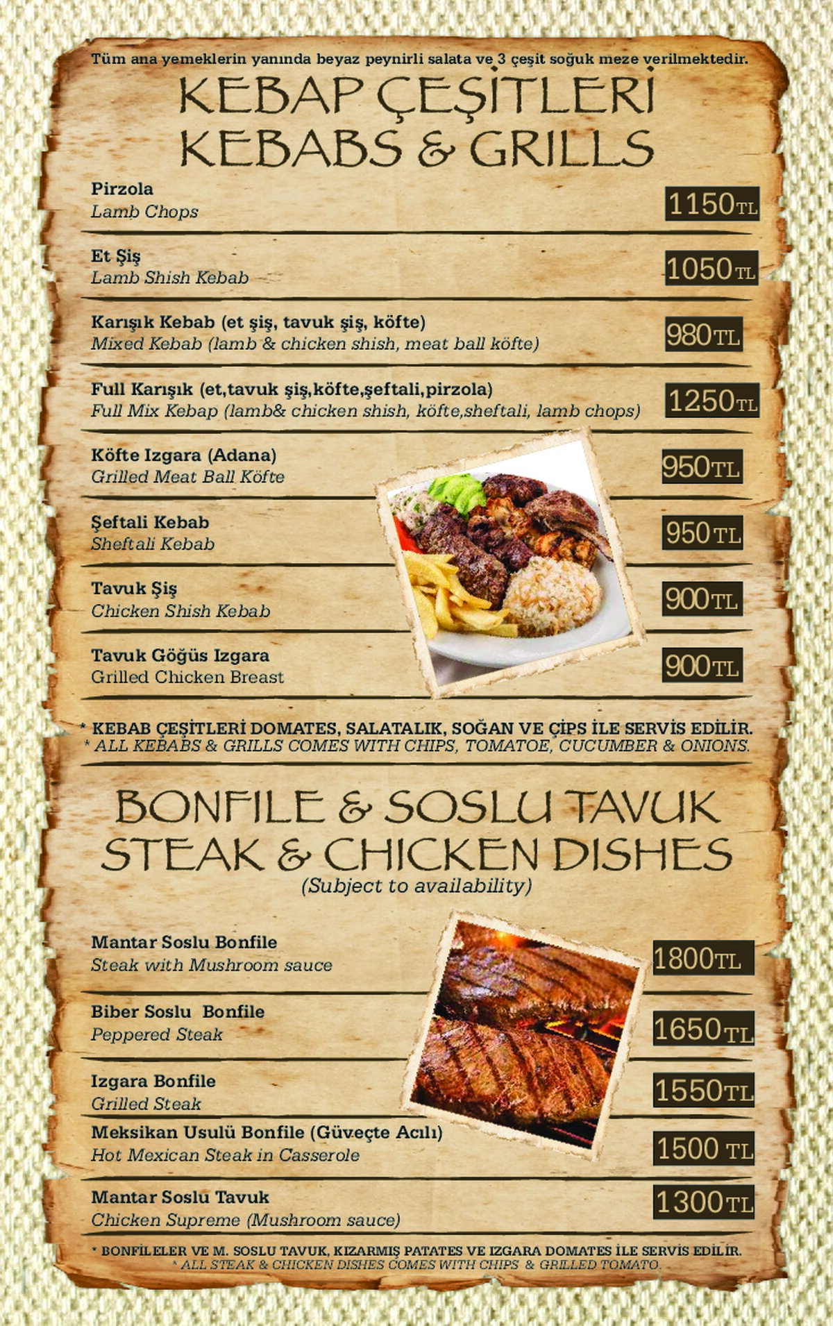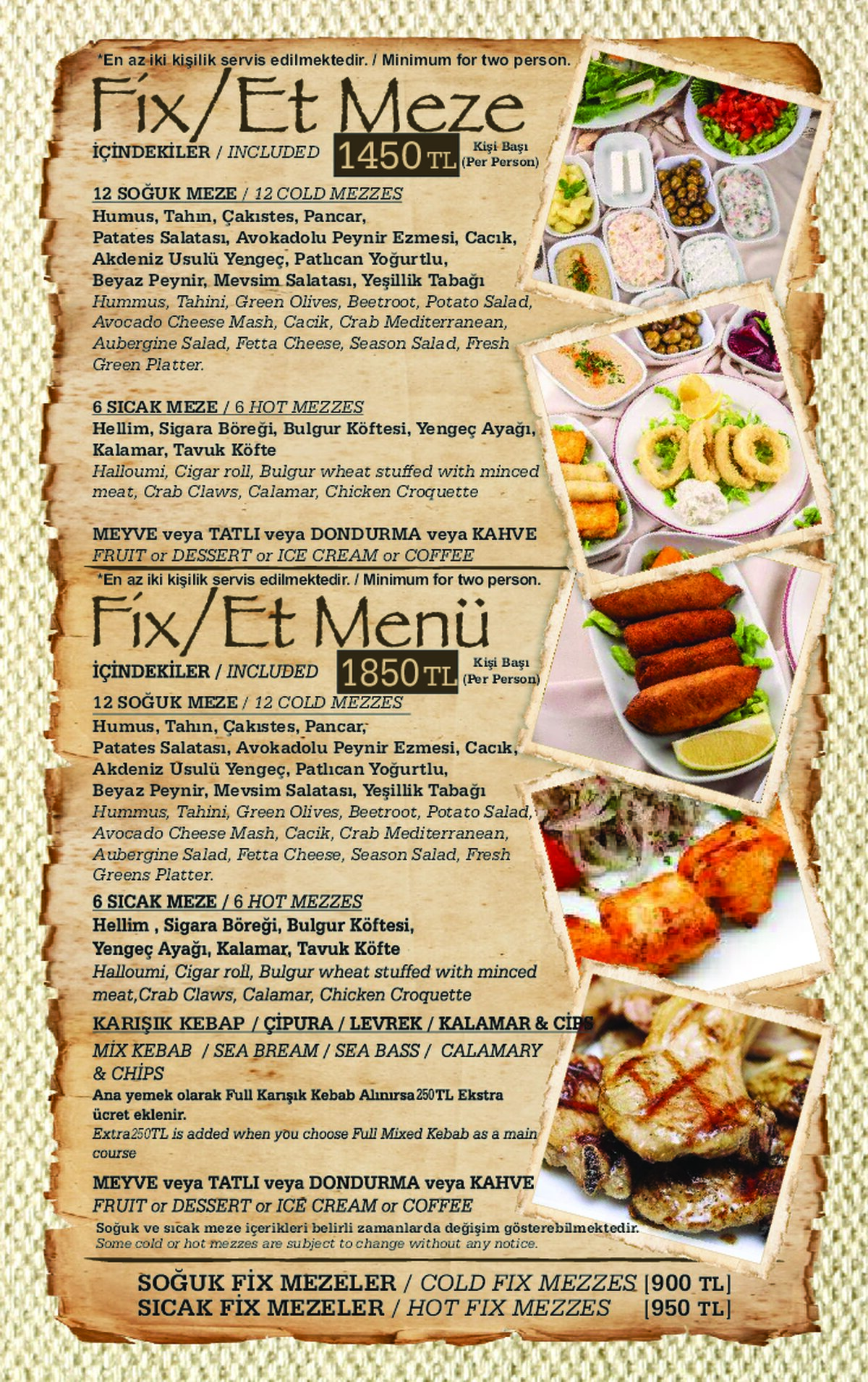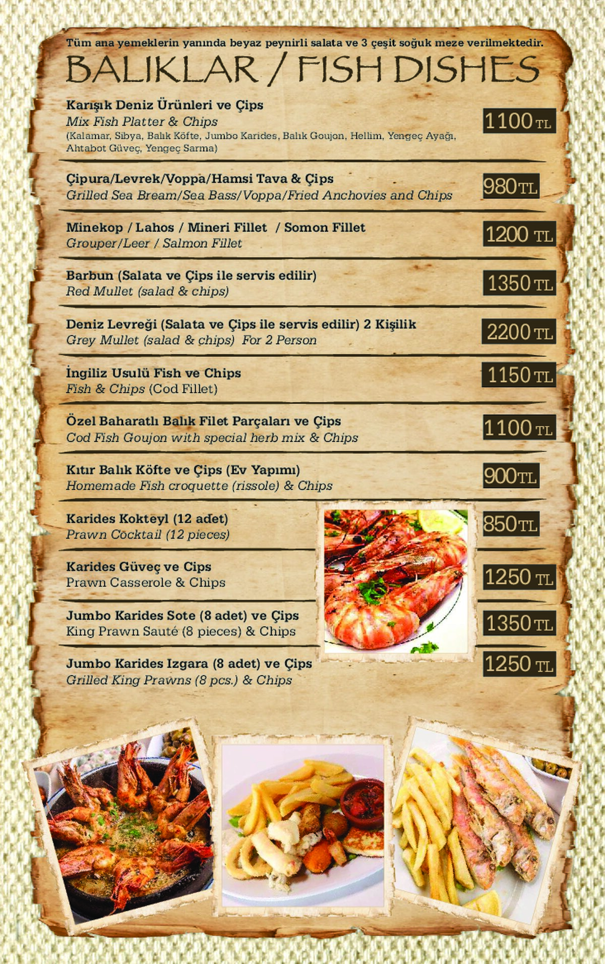 Für Fischliebhaber bieten wir eine große Auswahl an Fisch-Menüs an, welche kalte & warme Mezzes (Vorspeisen) und täglich frischen Fisch aus dem Mittelmeer beinhalten. Alle, die keinen Fisch mögen, können unsere Menüs und Kebabs probieren, die Ihnen mit kalten und warmen Vorspeisen serviert werden.