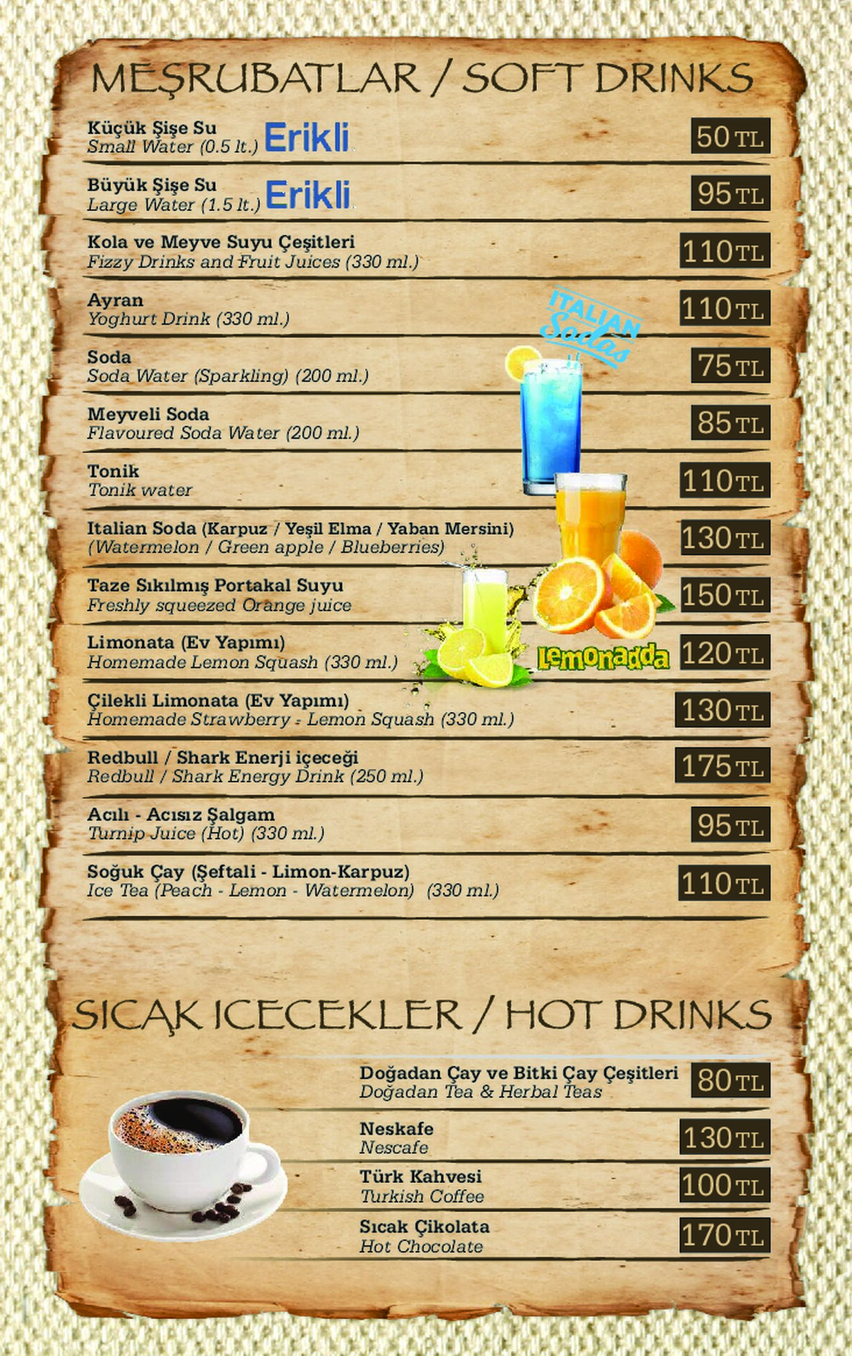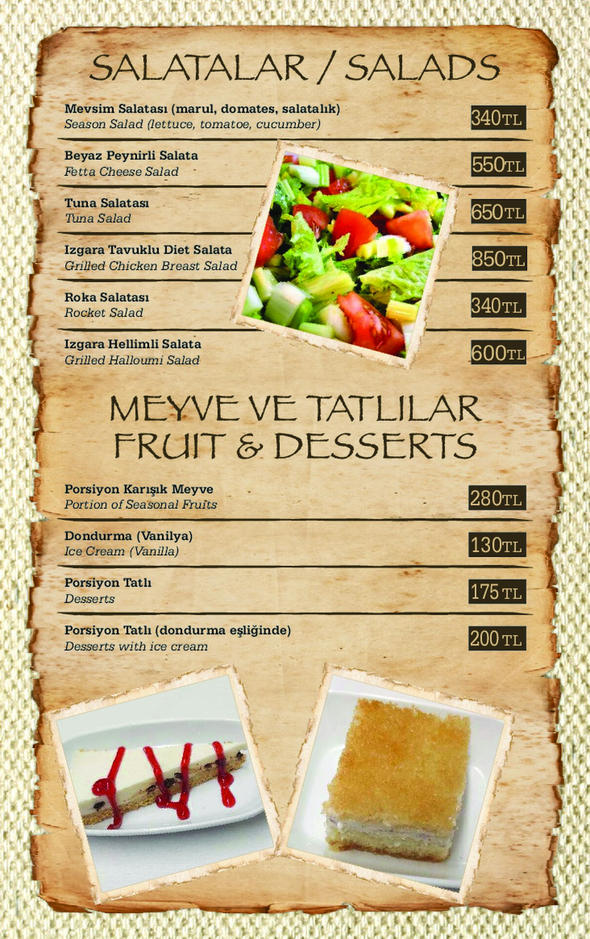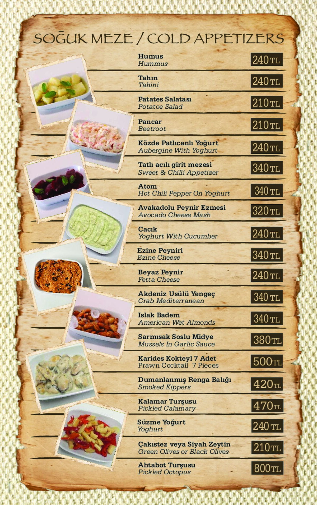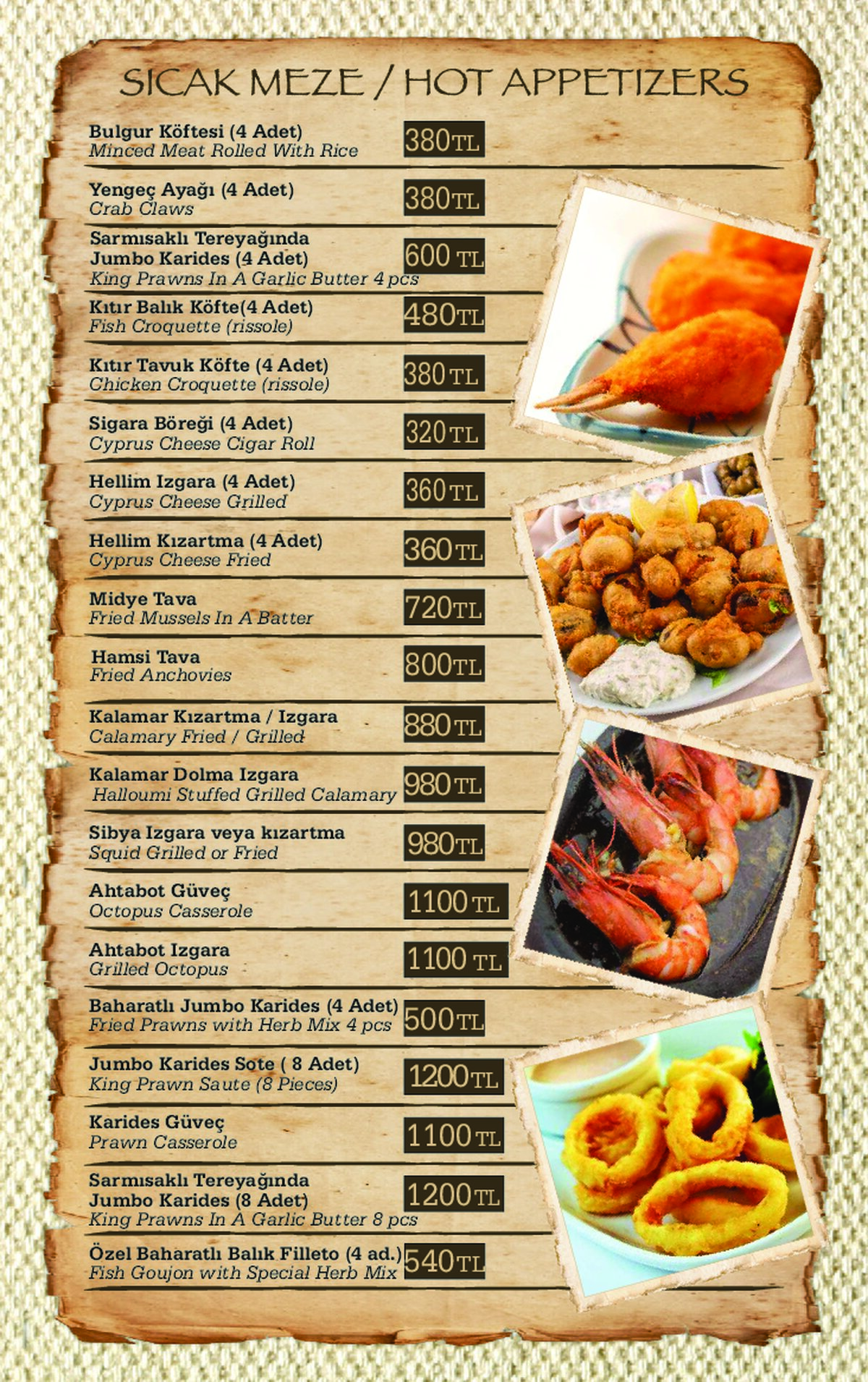 Für Fischliebhaber bieten wir eine große Auswahl an Fisch-Menüs an, welche kalte & warme Mezzes (Vorspeisen) und täglich frischen Fisch aus dem Mittelmeer beinhalten. Alle, die keinen Fisch mögen, können unsere Menüs und Kebabs probieren, die Ihnen mit kalten und warmen Vorspeisen serviert werden.